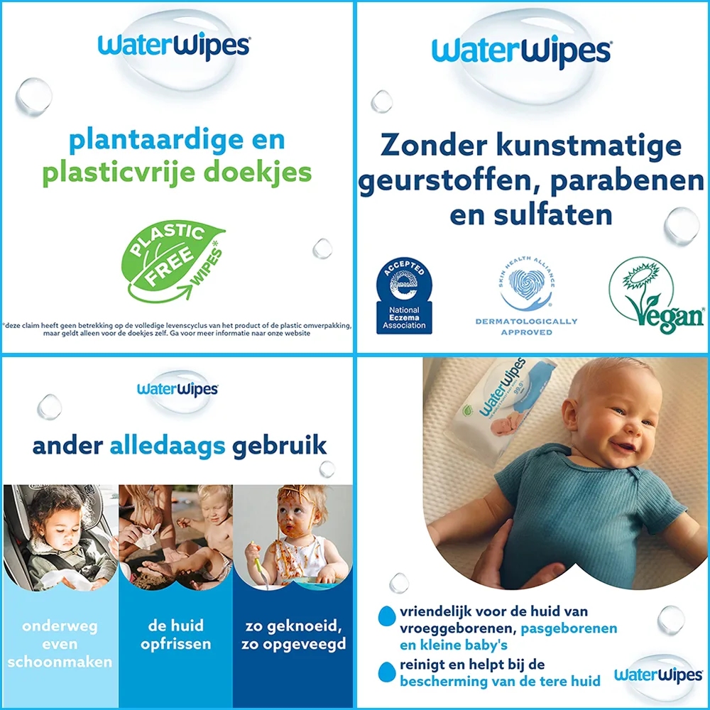 - Ideaal voor de huid van pasgeboren baby’s: De puurste huid verdient de puurste babydoekjes ter wereld. Onze WaterWipes billendoekjes zijn mild genoeg voor de meest gevoelige huid van pasgeboren baby’s en jonge kinderen.